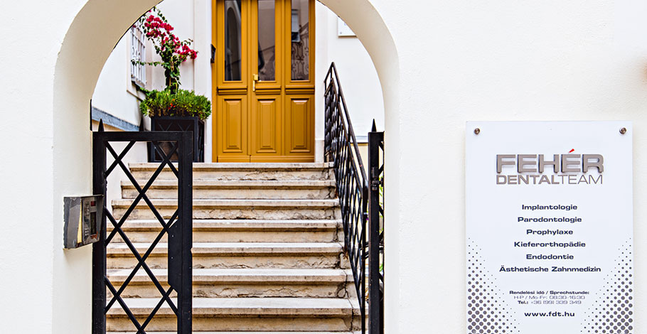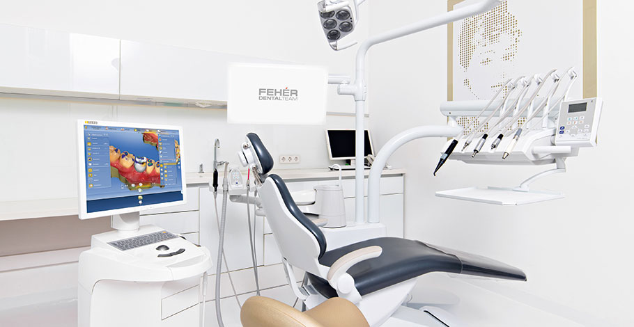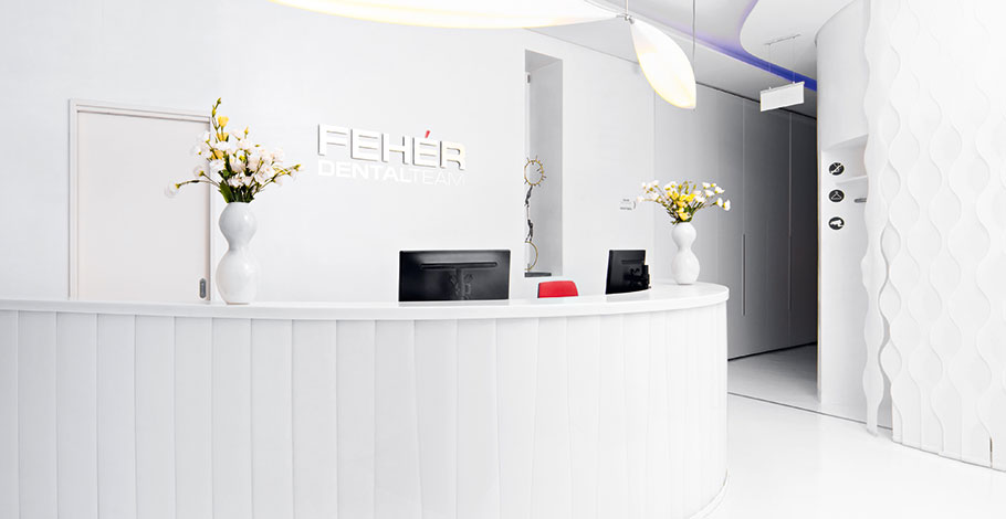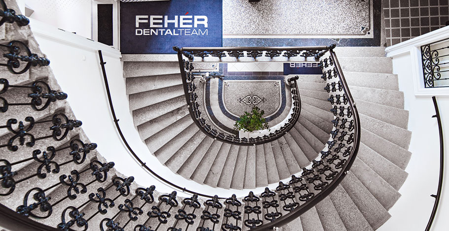 Das Fehér Dental Team praktiziert in einem herrschaftlichen Gebäude aus dem 19. Jahrhundert, das im Herzen der Altstadt von Sopron steht. Das Haus beeindruckt die Besucher:innen mit einem ungemein reizvollen Kontrast: Aus dem stilvoll restaurierten Treppenhaus betritt man die in strahlendem Weiß gehaltenen modernen Praxisräume. Den Weg zu den Behandlungszimmern weist ein unter die hohe Decke projiziertes Leuchtband, das jeden Tag in einer anderen Farbe leuchtet.