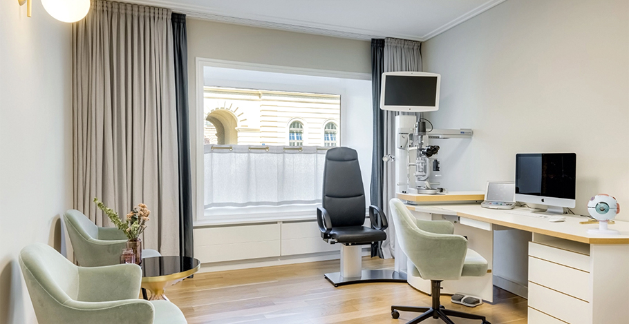 Gesunde Augen und gutes (Aus-)Sehen bedeuten hohe Lebensqualität. Dass dies der Anspruch auch beim Praxiskonzept von Augenärztin Dr. Janna Harder ist, spürt man schon, noch bevor sich die Tür öffnet: Sie liegt am Odeonsplatz, in einem der schönsten klassizistischen Ensembles Münchens, dem Ludwigpalais. Von der berühmten Ludwigstraße mit ihren Prachtbauten kommend, einmal um die Ecke biegen, schon steht man am Eingang zu einem schönen Innenhof und der Privatpraxis. Die Glasfenster in der Tür erlauben einen ersten Blick nach drinnen. An der Rezeption fühlt man sich nicht wie beim Augenarzt, sondern wie beim Einchecken in ein kleines, feines Hotel.