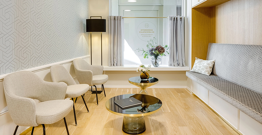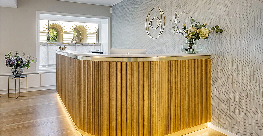 Kein Zufall, wie die Ärztin, die das Designkonzept selbst entwickelt hat, erzählt: „Ich habe natürliche Materialien wie Eichenholz, Messing, Leinen und zurückhaltende Farben gewählt, um eine beruhigende Atmosphäre zu schaffen, die zum Teil auch an ein Boutique-Hotel erinnern kann.“ Beruhigende Atmosphäre ist das Stichwort, denn noch etwas fällt auf: Hier herrscht nicht die übliche Praxishektik. Während man auf seinen Termin wartet – was schon sehr selten ist, denn das Praxismanagement ist perfekt organisiert –, kann man einen Cappuccino genießen und die Augen über die stylischen Blumenarrangements auf den Mid-Century-Tischchen schweifen lassen.