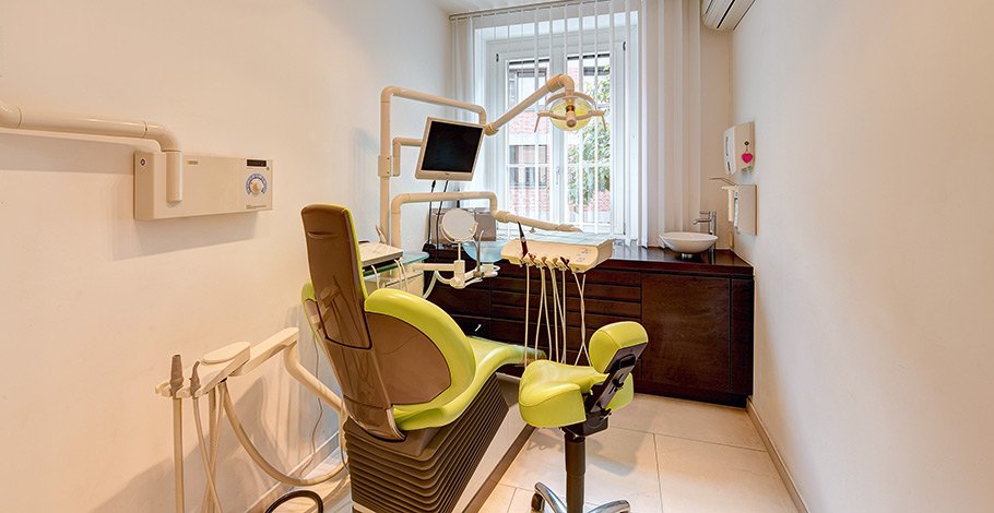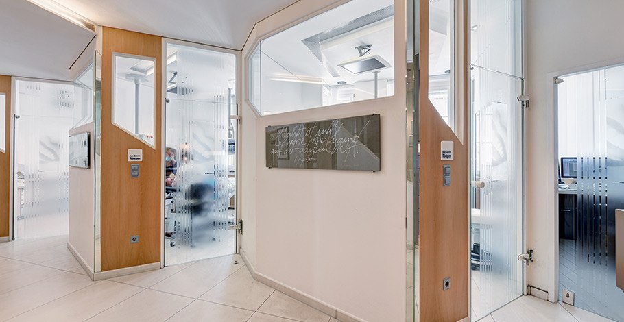 Trotz der Spezialisierungen bilden alle ein Team. So ist der Beratungsraum am Ende des Mittelgangs für Dr. Sörgel der wichtigste Platz in der Praxis. „Hier besprechen wir die Befunde mit den Patienten, erklären Heil- und Kostenpläne und diskutieren über den besten Behandlungspfad für den Einzelnen“, erklärt er. Von hier aus hat er auch einen guten Blick über die gesamte Praxis: Links reihen sich die fünf Behandlungszimmer. Rechts befinden sich das digitale Röntgen, ein kleines Labor und die drei Zimmer für die Dentalhygiene.