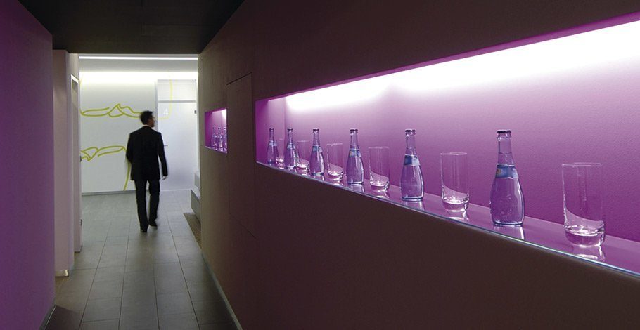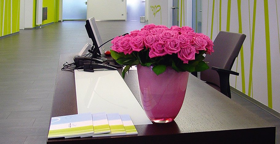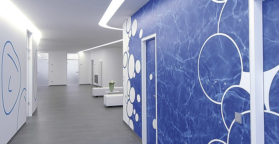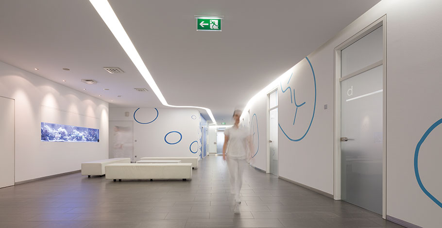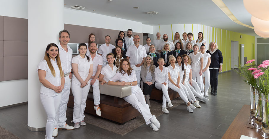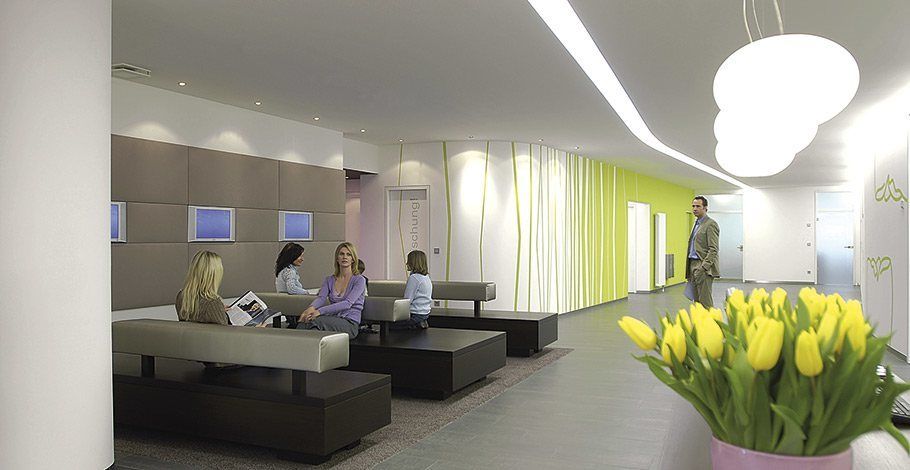 Die Klinik für Zahnheilkunde liegt verkehrsgünstig in Sindelfingen, etwa 15 Kilometer südwestlich von Stuttgart. Wer mit dem Auto anreist, parkt bequem in der privaten, kostenlosen Tiefgarage. Schon am Empfang überrascht die großzügige Architektur. Beruhigende Farben und indirektes Licht schaffen eine entspannte Atmosphäre. Der Blick schweift weit durch die luftigen Räume, dezente Musik beruhigt den Puls, in der Luft liegt der Duft frisch gebrühten Kaffees. Wer sich mit einem Magazin im Ledersessel zurücklehnt, kann leicht vergessen, dass hier High-Tech-Medizin praktiziert wird.