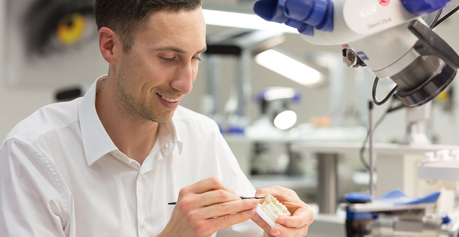 Was Dr. Dinkelacker und Dr. Brendel verbindet, ist die Begeisterung für Präzision in der Zahnheilkunde. Jeder Behandlungsempfehlung geht eine ausführliche Diagnostik voraus, präpariert wird mit der Lupenbrille oder dem Dentalmikroskop, den hochwertigen Zahnersatz liefert das hoch spezialisierte Dentallabor. „Unser Anspruch ist, so zu arbeiten, dass das Werkstück vom ersten Einsetzen an perfekt passt, perfekt funktioniert und hoch ästhetisch aussieht“, betont Dr. Brendel.