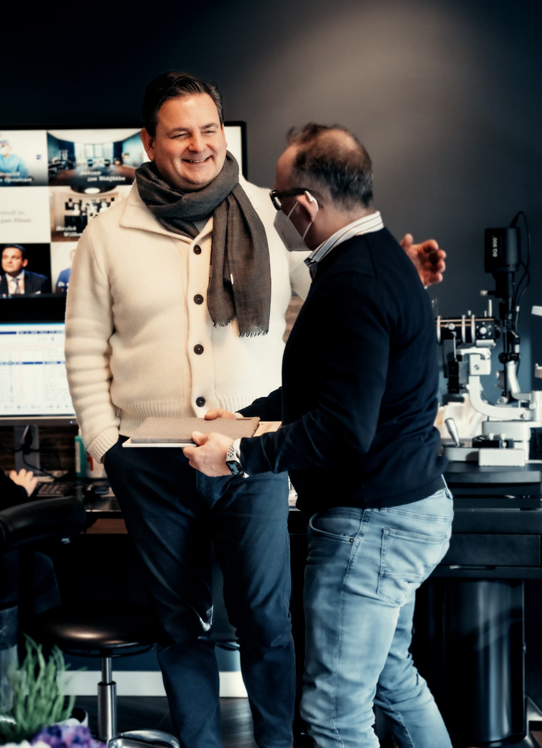 Dr. Hakan Kaymak – seit 2022 auch Top-Mediziner – leitet das „Zentrum für Makula, Netzhaut und Glaskörper“ in Düsseldorf-Oberkassel. Er beherrscht das gesamte Spektrum minimalinvasiver Glaskörper- und Netzhautoperationen und forscht mit innovativen Lasertherapien z. B. bei Patient:innen mit Glaskörpertrübungen oder Netzhauterkrankungen – seine Arbeiten finden international viel Beachtung. Bei Makulaerkrankungen kombiniert er oft Laser- und Medikamententherapien, weil das für die Patient:innen weniger belastend ist, und implantiert bei Bedarf spezielle AMD-Linsen mit vergrößerndem Effekt. Glaskörperoperationen führt Dr. Kaymak routinemäßig mit der schonenden 27-Gauge-Technik durch, die ohne Naht auskommt und weniger Risiken birgt. Ein weiteres Steckenpferd von Dr. Kaymak ist die Myopieforschung, die er zusammen mit Prof. Schaeffel aus Tübingen vorantreibt.