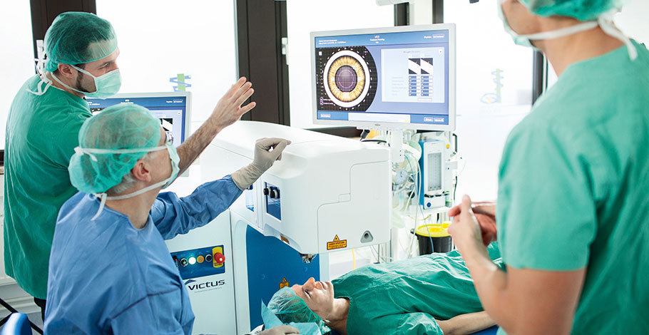 In Farmsen operieren mindestens zwei Ärzt:innen ganztägig in drei OP-Sälen. Die häufigsten Eingriffe liegen im Bereich der Glaukom- und Kataraktchirurgie. Getrübte Linsen bei Katarakt operiert Dr. Heuer alternativ zu Skalpell und Pinzette mit dem Femto-Phako-Laser. Das Gerät zerkleinert die alte, eingetrübte Linse sanft mit Laserenergie. „Der Femto-Laser ermöglicht größte Genauigkeit und schont die inneren Strukturen des Auges, da wir in der Regel auf Ultraschallenergie verzichten können“, erklärt der erfahrene Ophthalmochirurg.