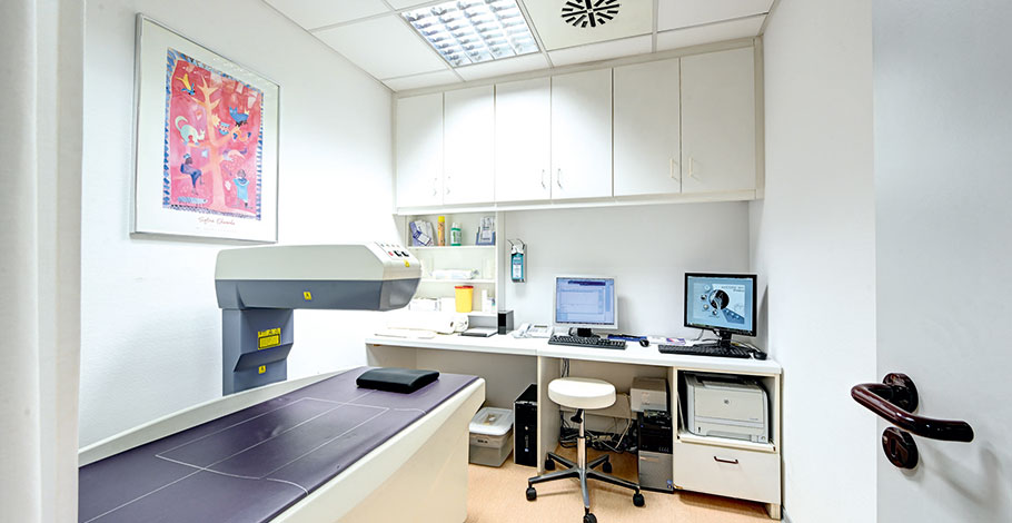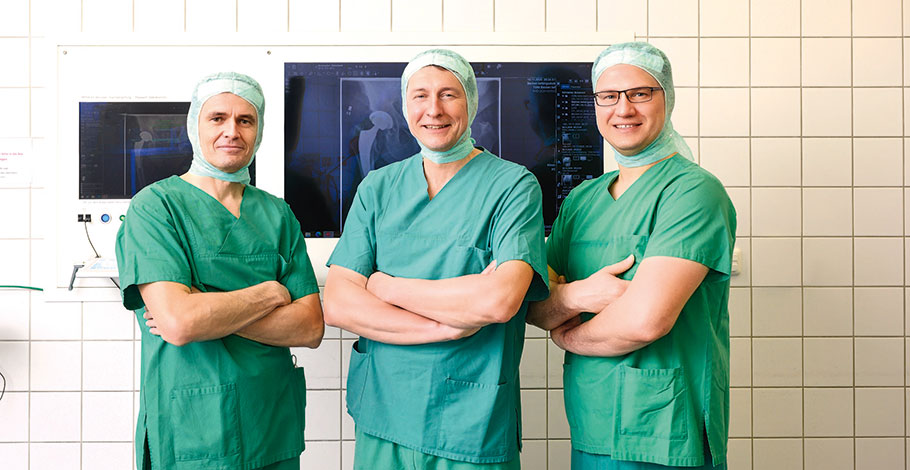 Die Eingriffe verteilen sich auf drei Hauptoperateure aus der Hofer Praxis: Neben Simank operieren MU Dr. Jan Vagner, ebenfalls Partner der Gemeinschaftspraxis, und Oberarzt Andreas Haas. Das Team absolviert an festen Tagen Sprechstunden in den Praxen in Hof und Münchberg. Zusätzlich arbeitet Simank in der Praxisgemeinschaft Orthopädische Chirurgie Bayreuth (OCB). Operiert wird hauptsächlich in der Klinik Münchberg. „Dort verfügen wir über eine eigene Abteilung mit drei Stationen, auf denen wir Platz für bis zu 70 Patienten haben“, erzählt der Facharzt für Orthopädie und Unfallchirurgie.