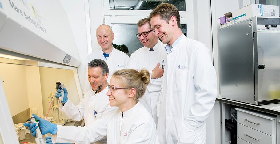 Nicht nur im OP, auch im klinikeigenen Forschungslabor interessieren sich die Bonner Orthopäden für Knochendefekte und infizierte Gelenke. Gemeinsam mit den Wissenschaftler:innen des nahe gelegenen Deutschen Zentrums für Infektionsforschung (DZIF) wollen sie zukünftig die Erreger einer Gelenkinfektion schon vor der Operation aufspüren. „Wir entwickeln Antikörper, die an der Oberfläche von Bakterien andocken“, erklärt Wirtz. „Kombiniert mit nuklearmedizinischen Tracern leuchten die infizierten Stellen in der Computertomographie auf.“