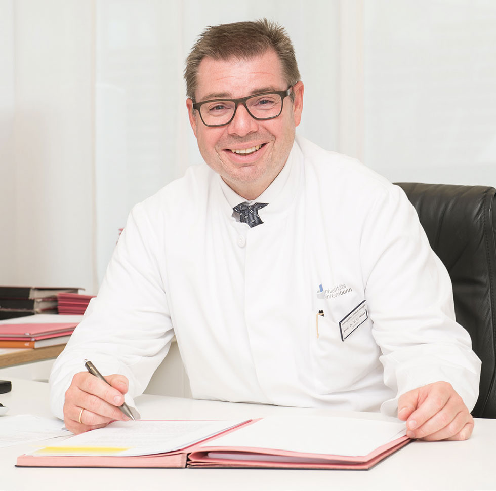 Professor Dieter Christian Wirtz wurde im Jahr 2006 mit nur 39 Jahren als jüngster Ordinarius für Orthopädie und Unfallchirurgie an die Spitze der Bonner Uniklinik berufen. Er galt schon damals aufgrund seiner breiten Ausbildung als erfahrener Operateur und hochkompetenter Ratgeber. Seit seinem Start ist die „Bonner Orthopädie & Unfallchirurgie“ stetig gewachsen. Heute verfügt die Klinik auf mehreren komfortabel ausgestatteten Stationen über 120 Betten und ist die größte Abteilung des Universitätsklinikums: Im vergangenen Jahr setzten die Ärzt:innen dort mehr als 800 Prothesen an Knie und Hüfte ein, behandelten 4500 Patient:innen stationär und 30 000 ambulant.