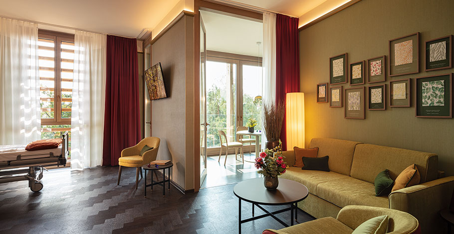 Mit hochwertigen und natürlichen Materialien sowie einem einmaligen Design soll die:der Patient:in zum Gast werden und den Aufenthalt bestmöglich genießen. Der Schlüsselbegriff dieses Konzepts lautet „Hospitality“ – hinter dem englischen Wort für Gastfreundschaft verbirgt sich neben dem lateinischen Wort „Hospes“ für Gast, auch das Wort „Hospital“, also Krankenhaus. Doch herkömmliche Klinikstrukturen, wie lange kahle Gänge oder schmucklose Zimmer, wird man hier nicht finden. Vielmehr lädt eine gemütliche Lobby-Bar zum Verweilen ein und drei Restaurants locken mit kulinarischen Köstlichkeiten.