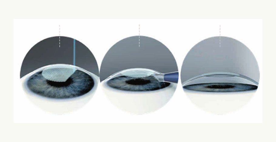 Der Femtosekundenlaser präpariert eine kleine Tasche (1) in die Hornhaut, Xenia® wird eingesetzt (2) und der Endbefund (3)