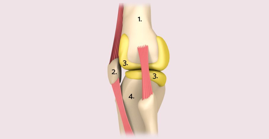 1. Oberschenkelknochen (Femur) 2. Kniescheibe 3. Zwei Knorpelscheiben (Menisken) 4. Schienbein