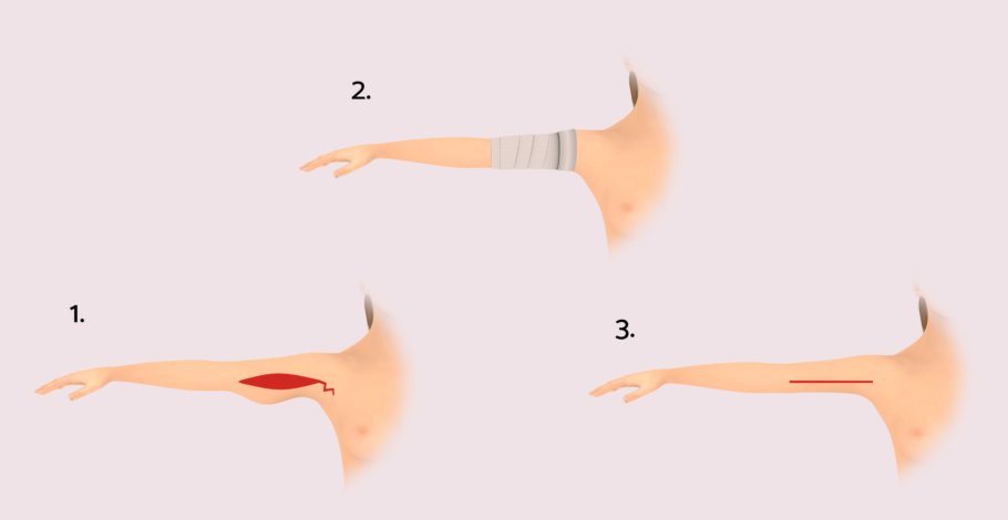 1. Schnittführung an der Innenseite des Armes, bis zur Achselhöhle und Entfernung einer Haut- / Fettspindel