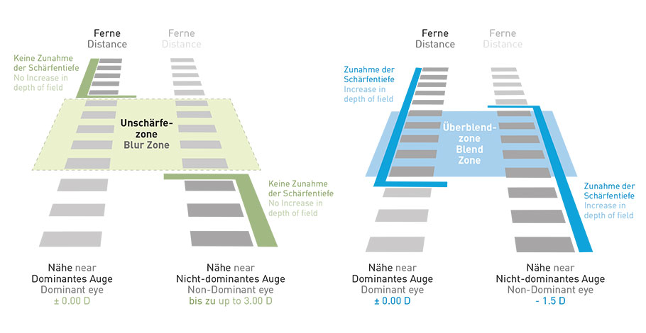Das Überblendvisus Augenlasern ist eine Behandlung, bei der die Augen mit unterschiedlichen optischen Prinzipien auf unterschiedliche Distanzen eingestellt werden. Zusätzlich führt ein spezielles Abtragungsprofi l bei beiden Augen zu einer Erhöhung der sphärischen Aberrationen, wodurch eine größere Schärfentiefe entsteht, das Kontrastsehen jedoch nicht beeinträchtigt wird. Die Kombination aus leichter Unterkorrektur und vergrößerter Schärfentiefe ermöglicht ein gutes Sehen in der Nähe, der Ferne und im mittleren Bereich. Da beide Augen um 1,5 dpt. voneinander abweichen benötigt es in der Regel eine neuronalen Eingewöhnungsphase von ca. ein bis drei Monaten. Durch die erhöhte Tiefenschärfe fällt die neuronale Adaptation an zwei unterschiedliche Dioptrienwerte beider Augen allerdings leichter und wird von den Patientinnen und Patienten meist sehr gut vertragen.